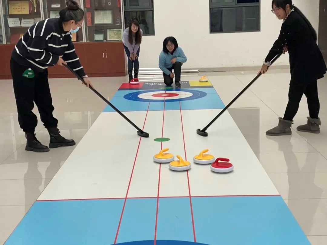 感受过丝巾的柔情魅力之后,女教工们展开了旱地冰壶比赛的激烈争夺。旱地冰壶是冬奥会冰壶项目的普及版,被誉为“地上的国际象棋”,既保留了冰壶运动的重要特质,又突破了冰雪运动对于场地的限制,智慧与激情并举,是一项手、脑、身、心协同发展的体育项目。斗智斗勇、斗技斗力的旱地冰壶活动,着实让大家过了一把“冬奥瘾”。参加的女教师们纷纷表示,这类活动既有新鲜感又具备运动量,更增加了同事之间的默契度,希望今后要多多开展,大家一定会积极参与,争取同男教师们也能一起比一比,赛一赛。
